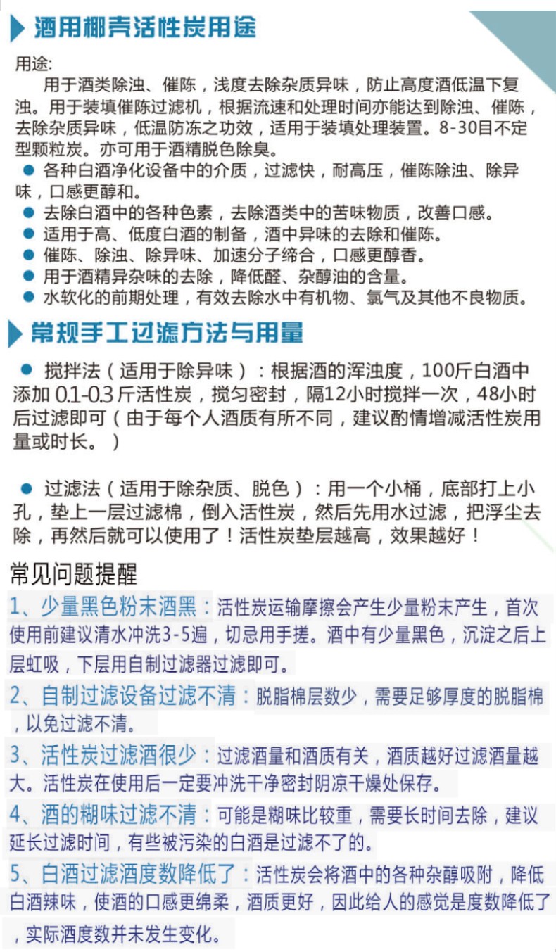 3.由于使用活性炭能去除低度白酒的沉淀,投資少,工藝簡單,效果好,不易產生渾濁沉淀,受到很多釀酒行業的使用。