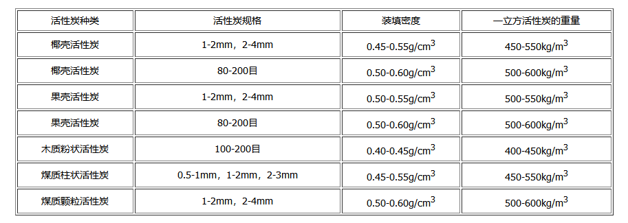 下表是竹之韻活性炭廠家根據產品的實際情況,為大家總結幾種不同類型活性炭產品的裝填密度,以及不同規格、種類活性炭一立方的重量,希望對大家有所幫助。
