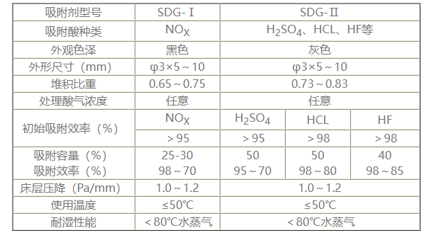 酸氣吸附效果較好的產(chǎn)品主要集中在SDG酸氣吸附劑和氧化鐵脫硫劑兩類,具體選擇根據(jù)實(shí)際處理的酸氣類型,使用場(chǎng)景及工藝要求綜合考慮。SDG酸氣吸附劑是當(dāng)前應(yīng)用較廣的酸性氣體凈化材料,具有吸附效率高,適用性廣,對(duì)環(huán)境友好,無二次污染和分型設(shè)計(jì)的特點(diǎn)。SDG酸氣吸附劑分為1型和二型,分別對(duì)硝酸霧和硫酸,鹽酸等氣體有較好的處理效果。